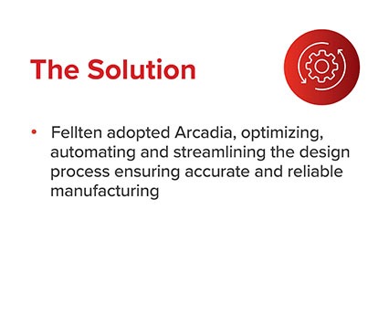 Time savings: Fellten has experienced time savings across the board in the design phase, but also in one unexpected place: communication. Before using Arcadia, time-consuming, back-and-forth emails had to take place with their manufacturer in China. Precise and complete documentation generated by Arcadia has eliminated that need, freeing up engineers to focus on other tasks.